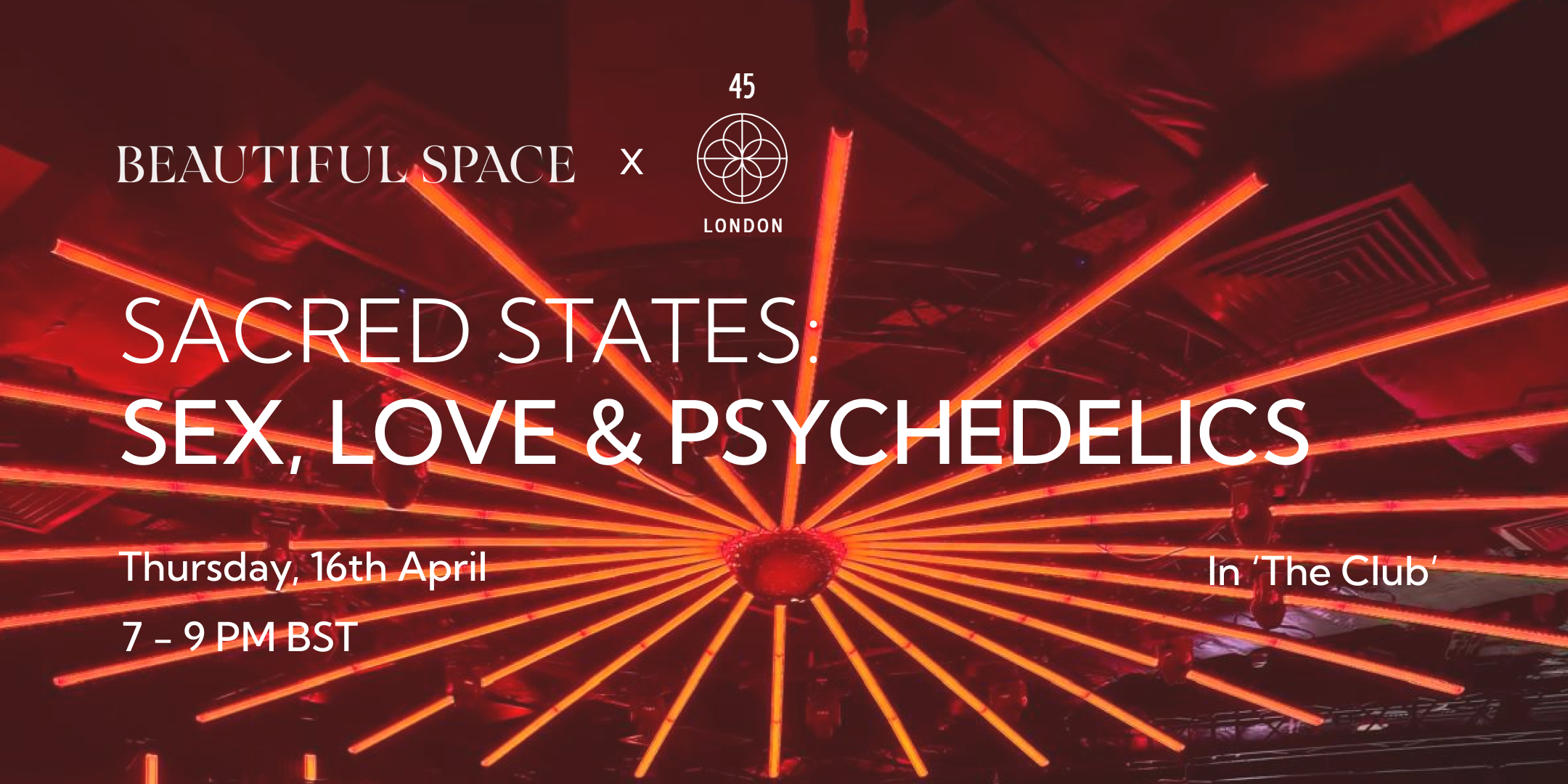 Sacred States: Sex, Love & Psychedelics is a private immersive live experience by Beautiful Space in collaboration with 45 London, set within the private Club Room.